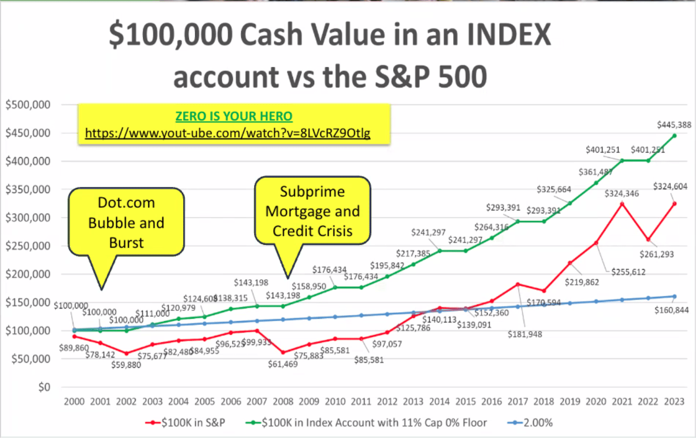 Protection Against Losses: The IUL includes a floor cap at 0%, meaning no negative returns in down markets, and a ceiling cap up to 11.5%, maximizing gains during favorable conditions.